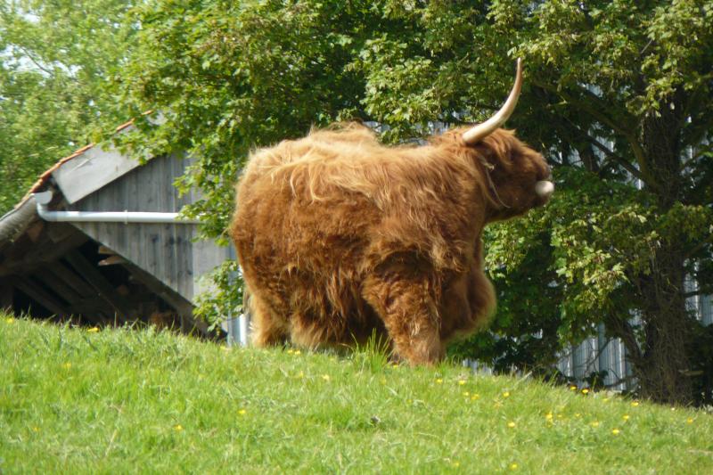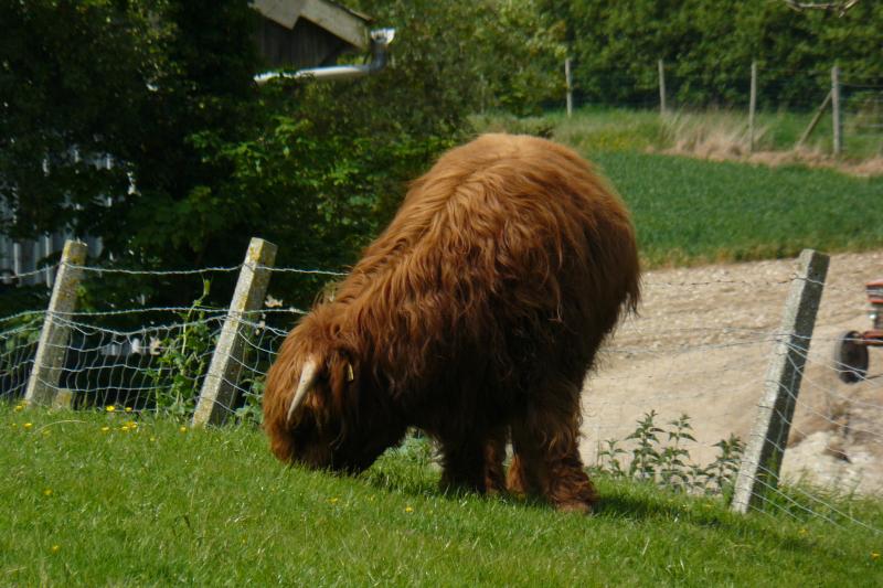 Bovines: race Highlander. Ils sont a rue d'eglise en Escalles.