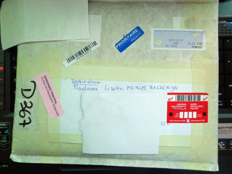 voilà le petit paquet de Noël pour Lisette a fini par me revenir ce matin ! pour "adresse insuffisante". Il manquait le numéro dans la rue que je ne connais pas. En tout cas. Merci la Poste, il ne s'était pas perdu !