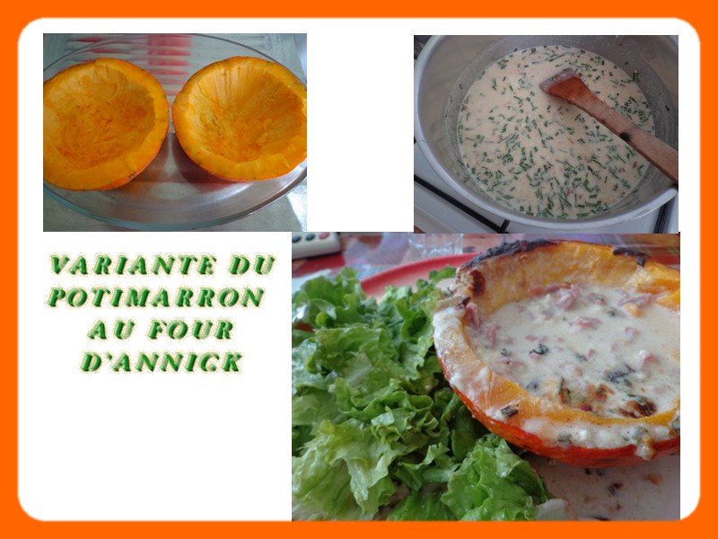 j'ai creusé le potimarron, placé les deux portions dans un plat légèrement huilé... j'ai fait revenir sans matière grasse des lardons allumettes, coupé du fromage à raclette en petits dés. Dans un faitout, j'ai mélangé, lardons, ail, poivre, quatre épices, ciboulette, crème fraîche vin blanc et fromage pour obtenir une fondue que j'ai versée dans le potimarron. 40 minutes à four 200 ° ... une petite salade.... merci Annick !