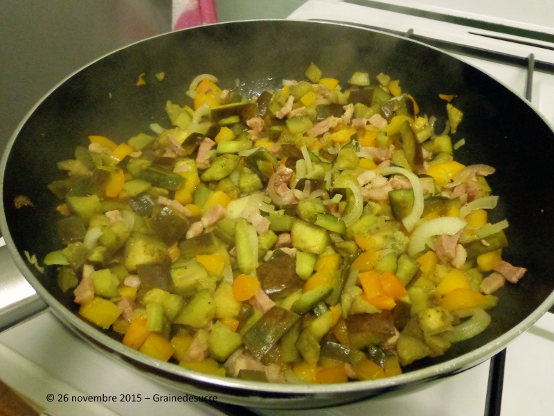 une envie de petits légumes... trois toutes petites aubergines, oignons, 1 poivron orangé, sel, poivre... un peu d'huile d'olive... quelques lardons...