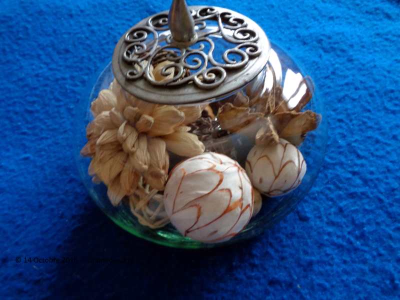 un sachet de plantes séchées automnales, un bocal... petite déco pour l'entrée à laquelle j'ajoute une petite note parfumée...