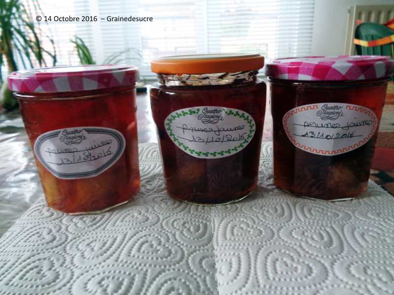 des prunes jaunes qui mûrissent mais dont l'intérieur reste attaché au noyau... hop... dernier paquet de gelsuc... et trois petits pots pour l'hiver...