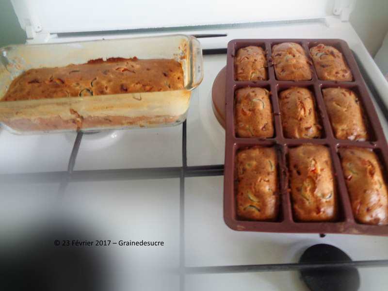 | Marc et Sylvie nous ont proposé cette recette originale (ici !) j'ai essayé... et... nous nous sommes régalés !   comme j'avais ouvert une grande boîte d'olives noires et que nous avions beaucoup de chorizo, je les ai utilisé avec un poivron rouge en petits dés et j'ai fait un grand cake et des petits cakes... une partie est au congélateur et nous serons heureux de les retrouver à l'occasion...