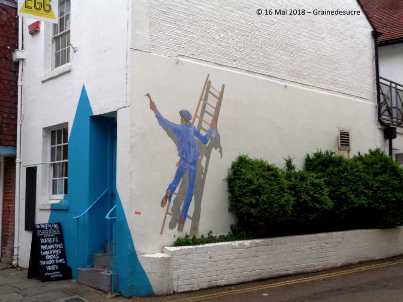 Ce trompe l'oeil est à Canterbury et j'ai trouvé très réussi ce peintre, un bel acrobate ! Il est sur le pignon d'un restaurant "the naughty egg"...