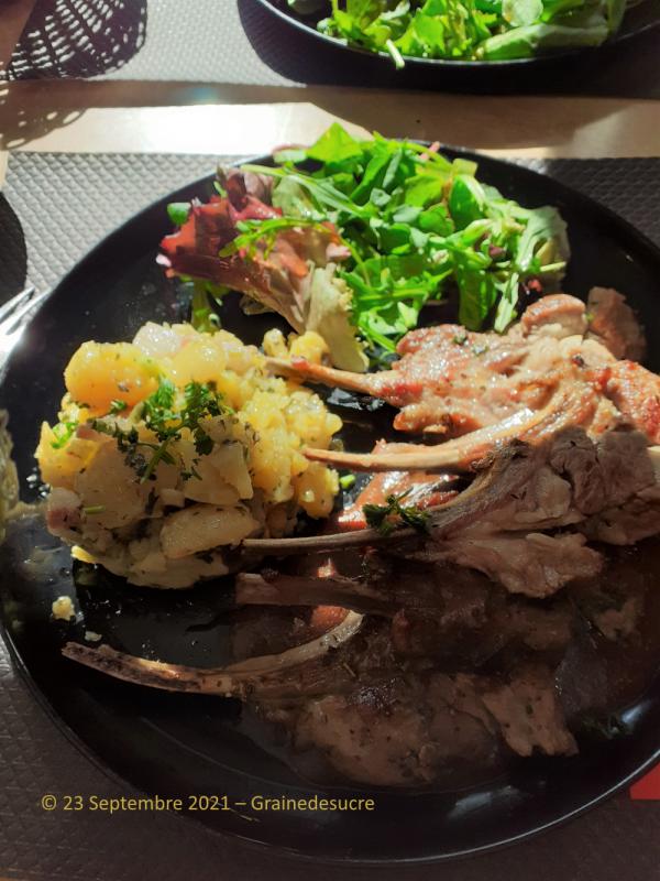 (5 côtelettes par personne) accompagné de petites pommes de terre sautées, fins lardons, échalotes) et d'une petite salade. Un Chardonnay bien frais pour compléter et en dessert un opéra avec un petit café allongé... une adresse à retenir et à conseiller !