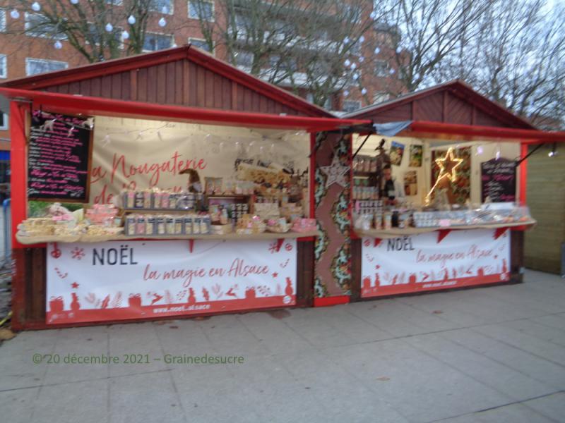 Cette année, nous accueillons l'Alsace et ses bons produits : nougats, vin de pays, bretzel, bredeles, de quoi régaler les plus gourmands. Dans les petits chalets c'est très sympathique et il règne une ambiance bon enfant...