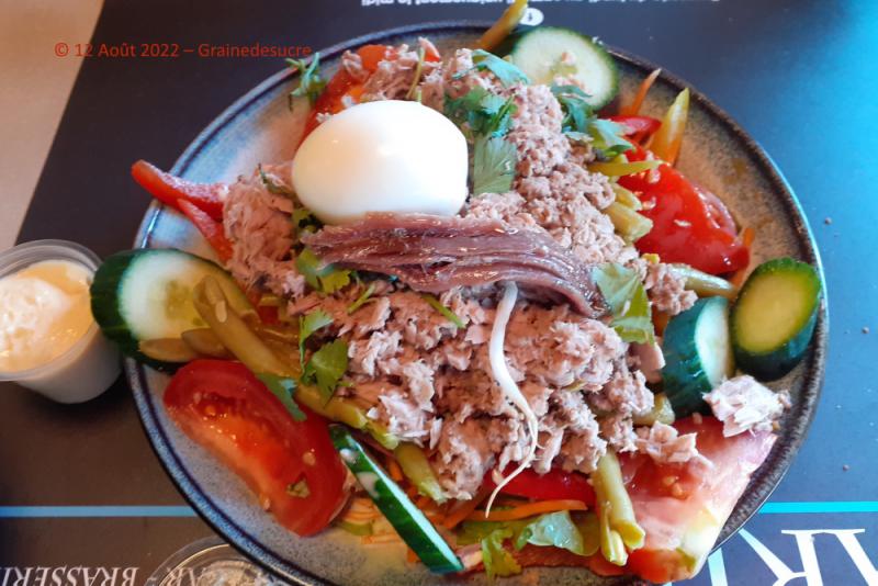 Après un kir à la pêche bien frais, mon amie choisit une salade niçoise et elle n'est pas déçue, c'est très copieux et délicieux !
