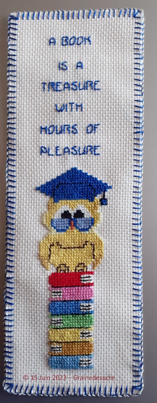 Il y a de très jolis modèles sur Internet et j'ai craqué pour ce gentil hibou. J'ai adapté avec un texte approprié et voilà. En plus, j'ai appris à ajouter une jolie finition au point feston. ça me donne bien envie de continuer ....