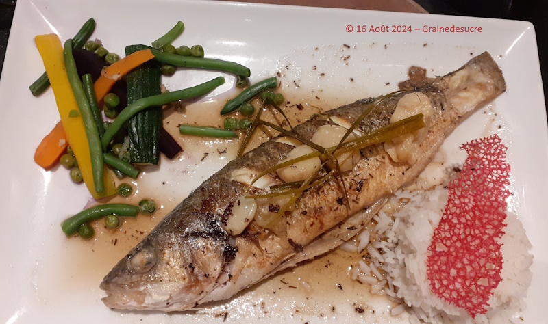 J'ai choisi le bar rôti à l'ail, petits légumes et riz basmati. cuit parfaitement, blanc, je n'en ai pas laissé une miette !