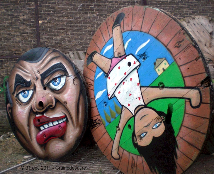 petit tour le 31 décembre : découverte d'une expression picturale (autrement dit un tag !) sur un support original... les bobines de câble inutilisées dans le port !