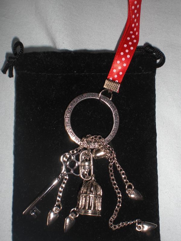 alors dans le sachet noir .... regardez ! c'est chouette, la petite cage (sans fond pour qu'il n'y ait pas de prisonnier, il y reste que si il veut) la mignonne et délicate petite clé et les petits coeurs ....