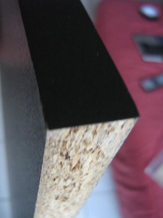 Le plateau est de l'aggloméré avec des bords bruts. Nous avons donc acheté du champ noir pour faire les finitions des bords. Nous sommes très satisfait du résultat.