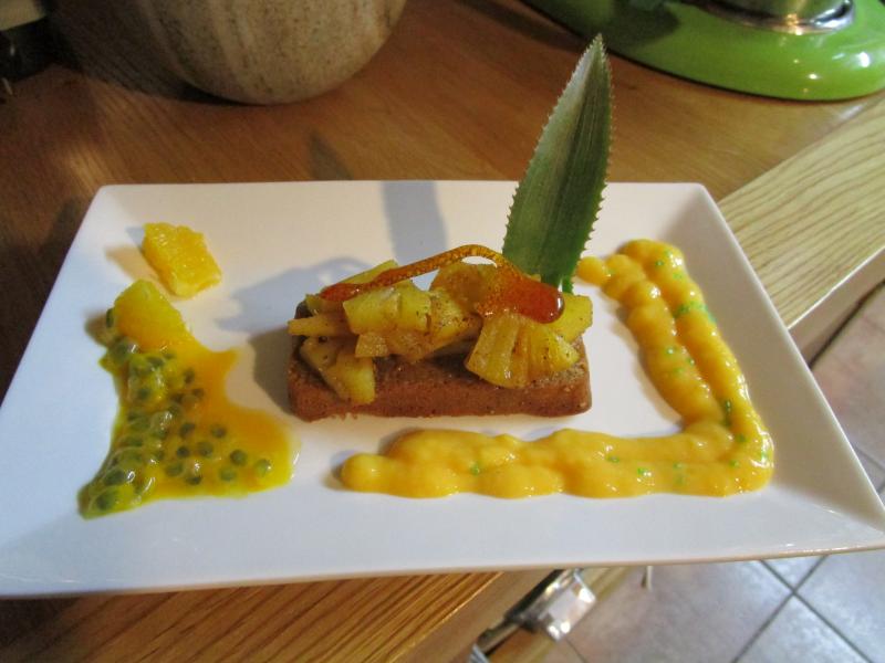 Voilà j'ai transformé mes financiers avec une poëlée d'ananas rôtie et flambée au rhum vieux, du fruit de la passion et un coulis de mangue avec un parfum de caramel bonne semaine à tous