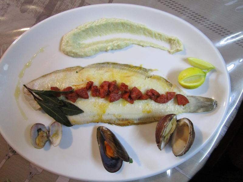 Sole grillée et ses coquillages, dés de chorizo, crémeux de fenouil, yuzu