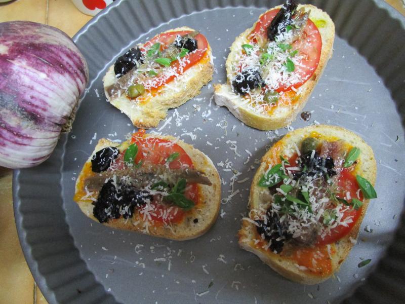 Couper de grandes tranches de pain, passer 2 poivrons au four, enlever la peau, les mixer avec un filet d'huile d'olives et du thym; tartiner les tranches, ajouter câpres, anchois, tomates, olives ,parmesan, faire griller au four 20 min décorer avec des feuilles de roquette