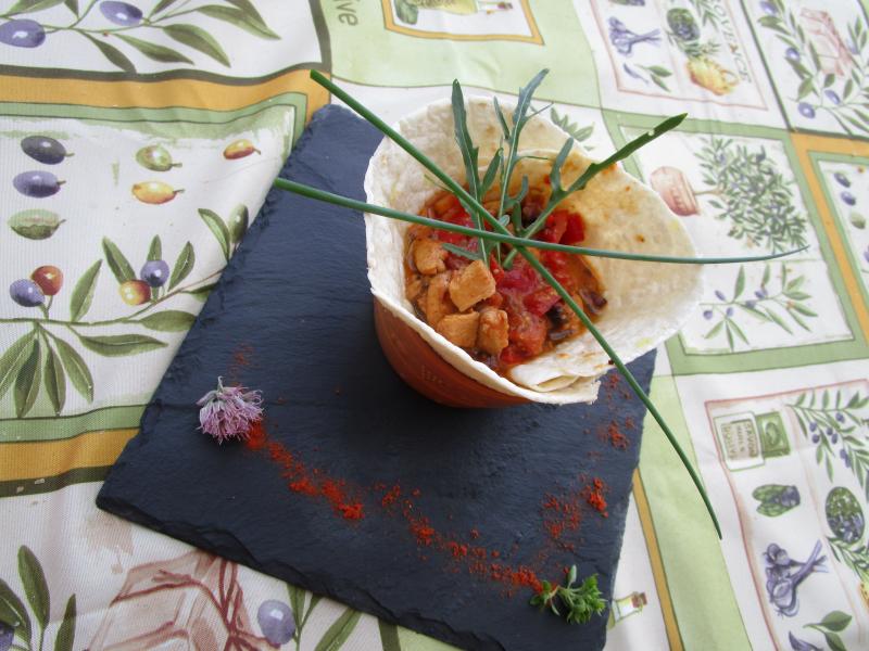 des  tortillas dans lesquelles vous glissez une farce de dés de poulets, poivrons,oignons ail, cumin, piments d'espelette, tomates, une cuillère de moutarde ancienne que vous aurez fait mijoter en réduisant au noilly prat