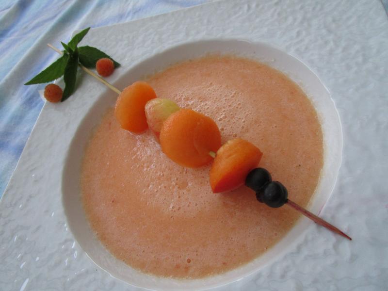 Mixer un melon, une pêche, un abricot avec 2 cuillères de sucre,un peu d'anis vert, faire une brochette en prélevant des boules de fruits avec une cuillère parisienne