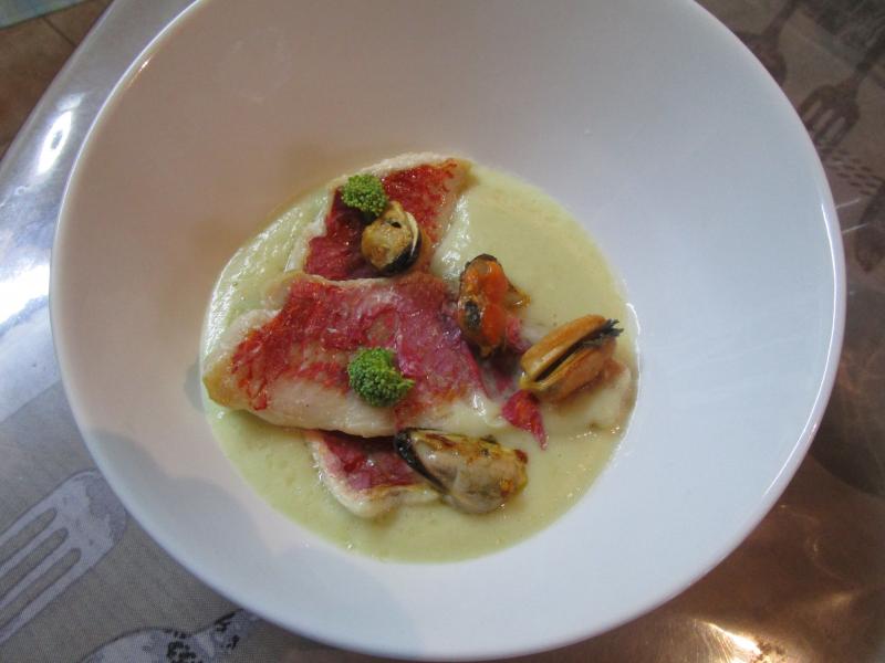 De petits rougets grillés à la plancha, du fenouil ,des échalotes, un peu de crème, quelques moules et des sommités de choux romanesco voilà une entrée sans prétention et pleine de saveurs marines et terrestres