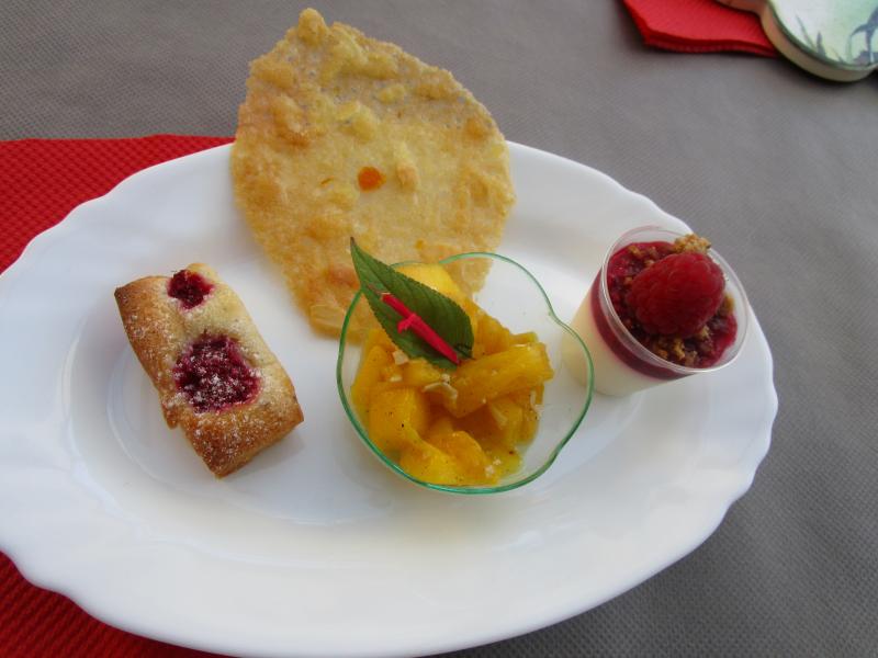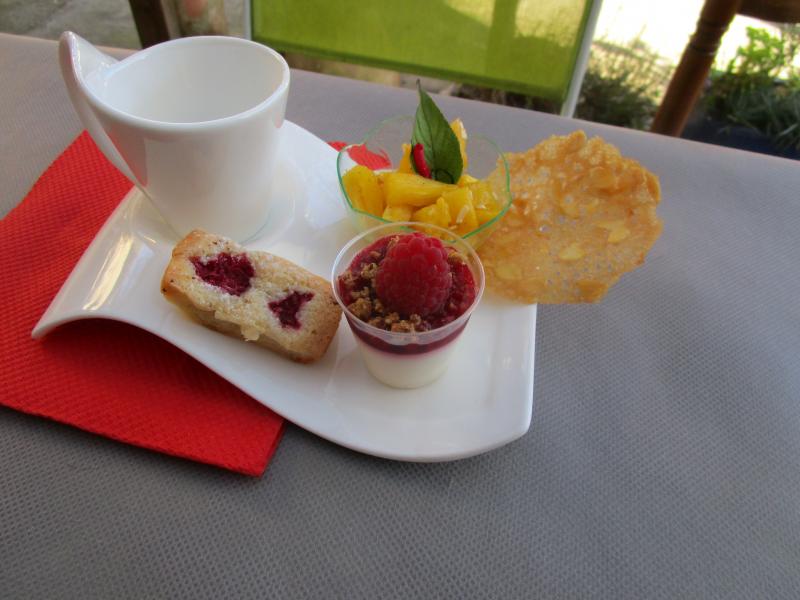 Une panna cotta vanille ,zestes de main de Bouddha, coulis de framboises crumble aux amandes