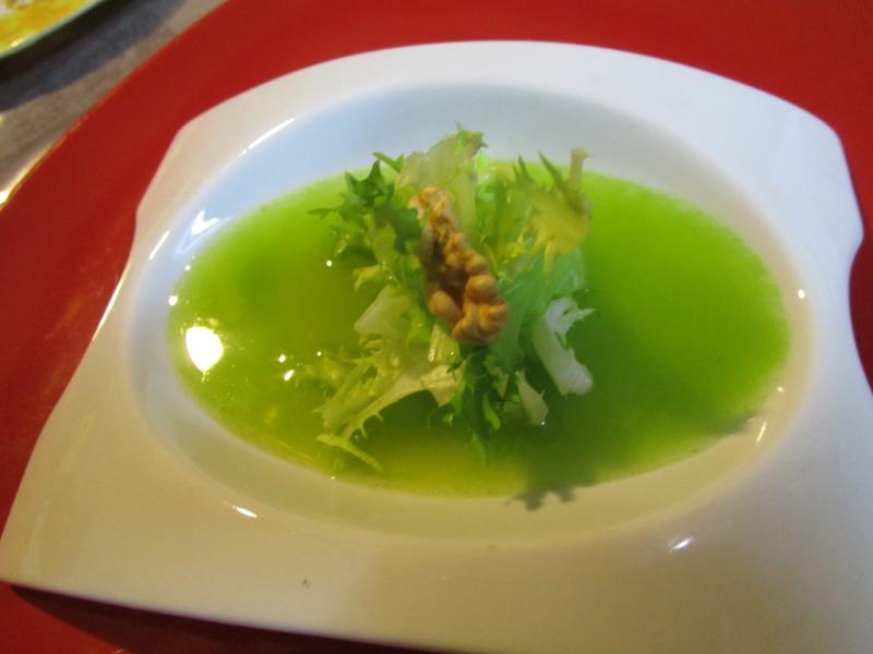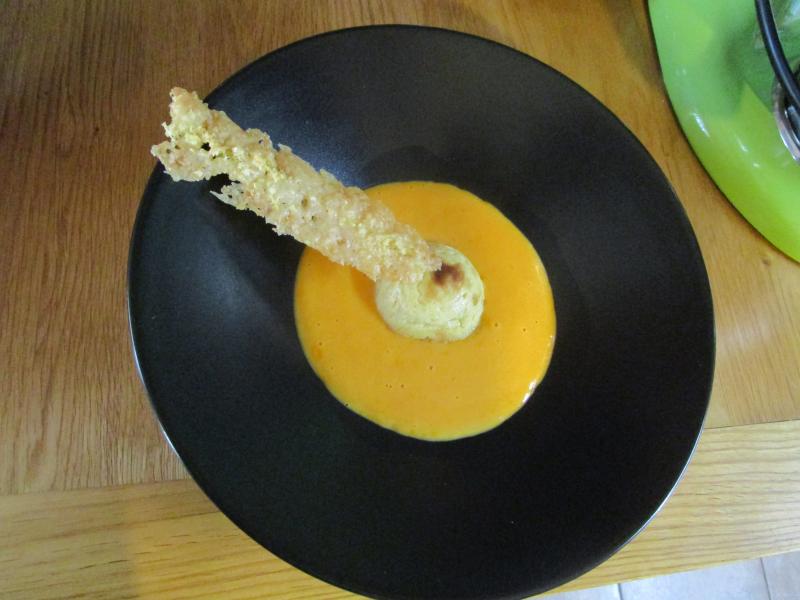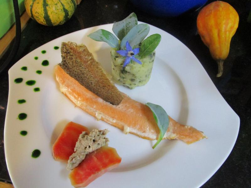 Salade à l'huile verte Flan de parmesan et sa chips , coulis de potimarron Filet de truite, écrasé de pommes de terre à l'huile d'olive, estragon,huitre végétale tartare de sardine et betterave Tarte aux pommes et au mascarpone