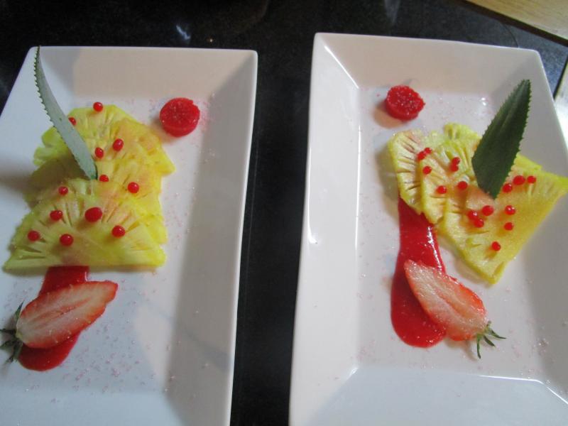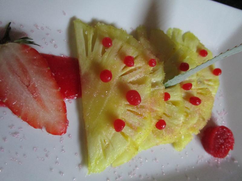 Voilà un carpaccio d'ananas au coulis et perles de fraises