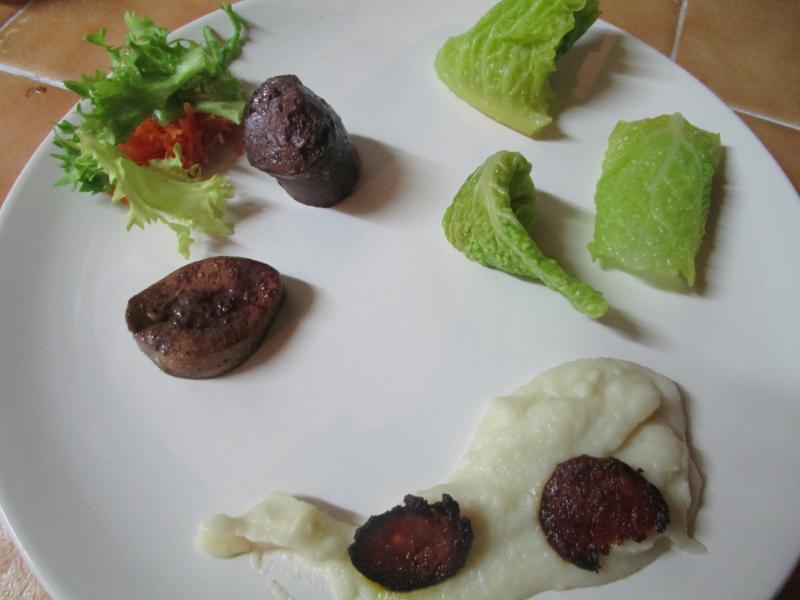 Une belle fricassée, du choux, un crémeux de cèleri à la crème de coco des rondelles de chorizo grillées