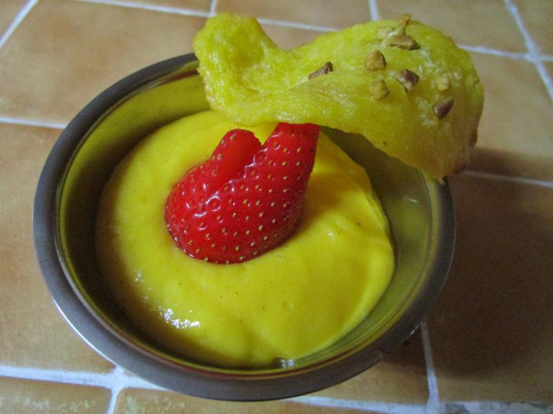 En dessert une mangue mixée avec de la crème de coco  quelques fraises avec une chips de mangue et pistaches