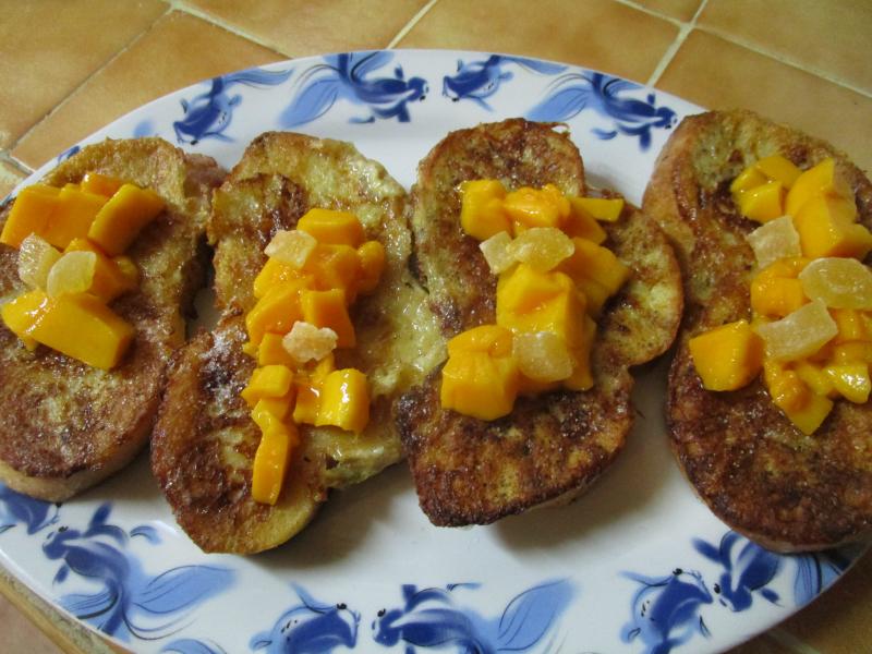 Pour le dessert , du pain perdu à la cannelle, salade de mangue , ananas confit et liqueur d'orange