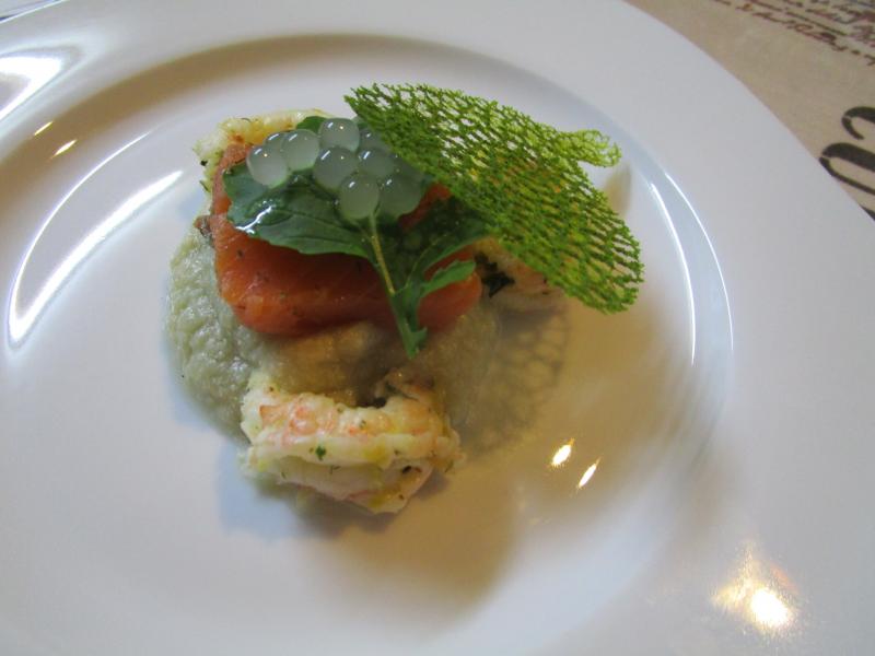 Salade de langoustines, truite fumée du Vercors, mousseline de fenouil, chips de roquette, perles de yuzu