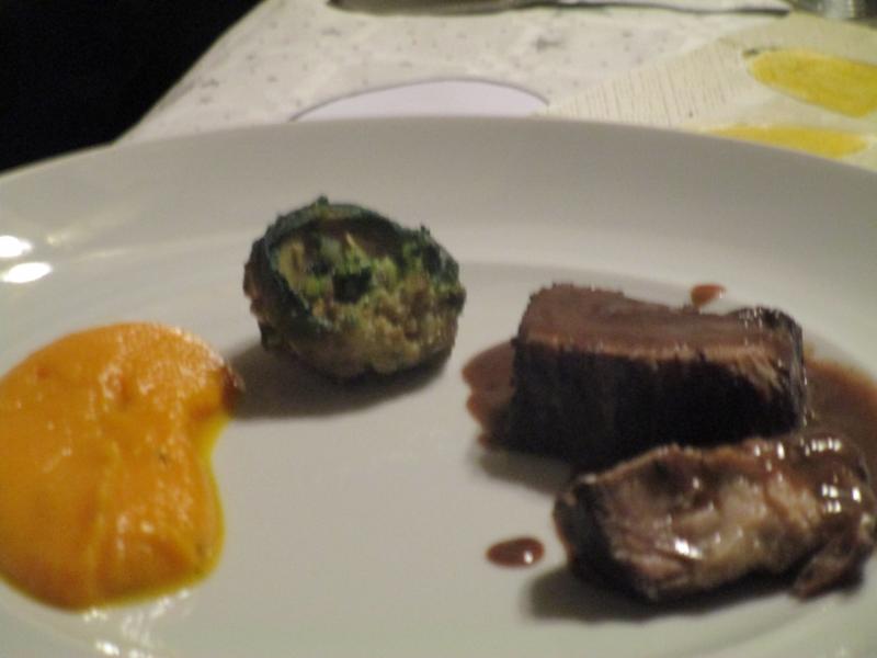 Rôti de sanglier, crémeux de potimarron huile de truffes, fonds d'artichauds