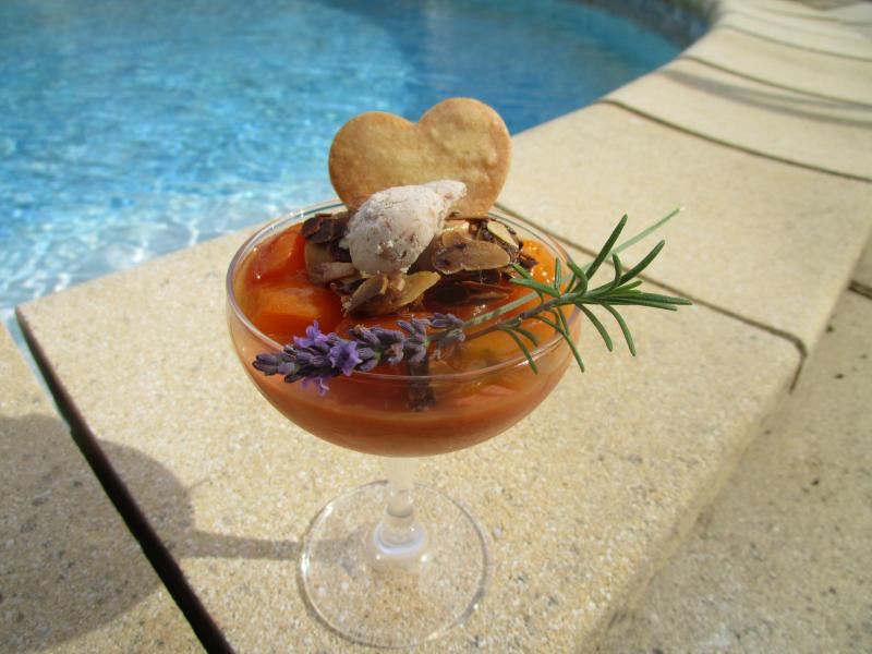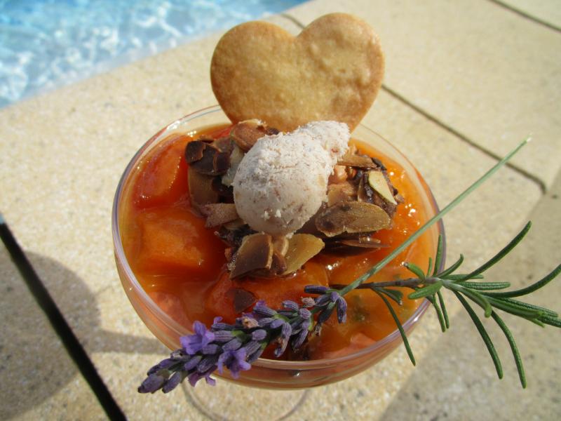 Une coupe toute en abricots ; en compote au romarin comme une pannacotta , recouverte de fruits rôtis à la lavande avec des amandes grillées et un petit sablé une touche de crème vanille bonne dégustation