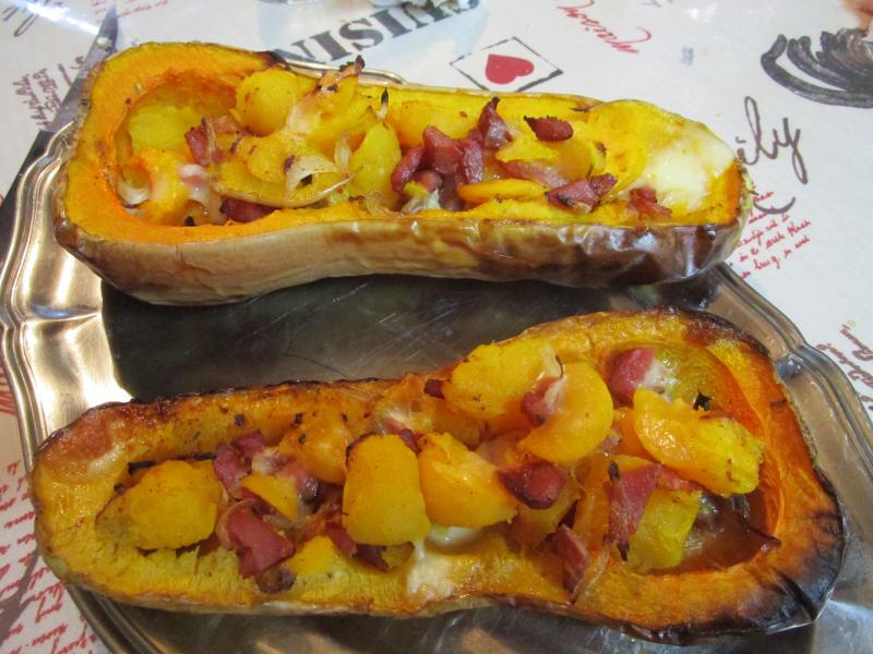 Coupez en 2 les butternuts passez les au four 30 min avec une cuillère parisienne prelevez la chair et mélanger la à des lardons et échalottes remplir les butternuts parsemez de fromage de raclette ou ce que vous avez sous la main il me restait du taleggio c'est un régal!!