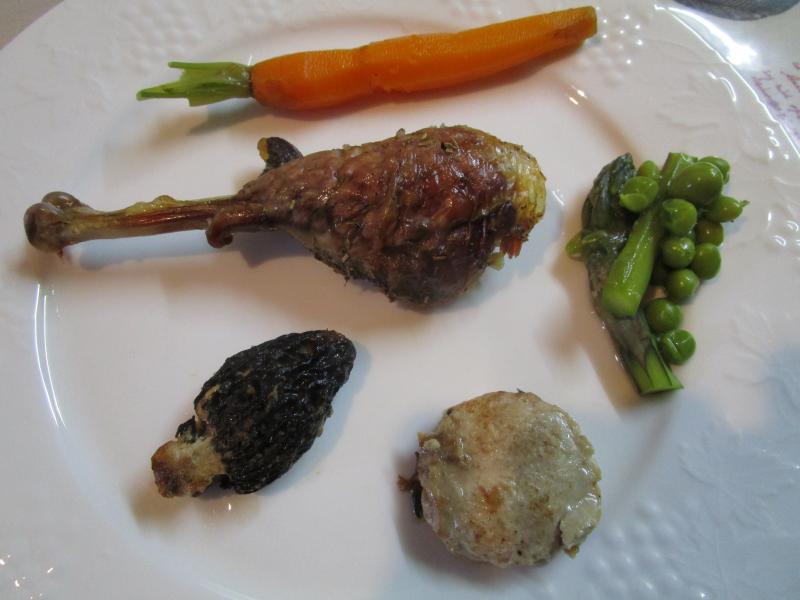 Pintade rôtie, morille farcie de farce fine de pintade, petits pois et asperges