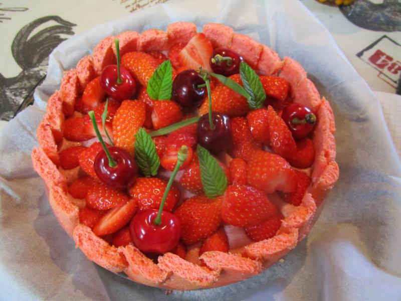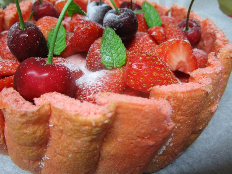 Une charlotte aux cerises et fraises parfumée à l'estragon