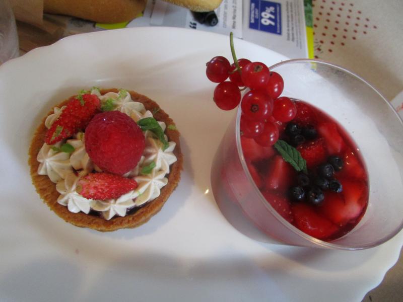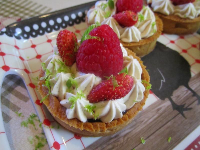 Une tartelette aux fraises des bois et framboises  ganache montée ivoire avec une soupe de fruits rouges