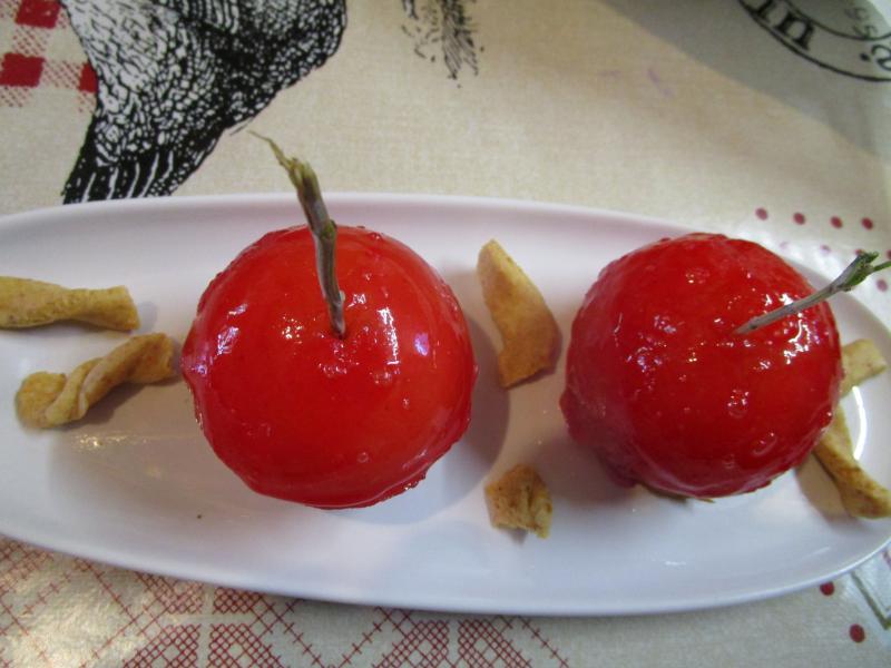 Voici une compotée de pommes vanille badiane moulée sous un glacage rouge