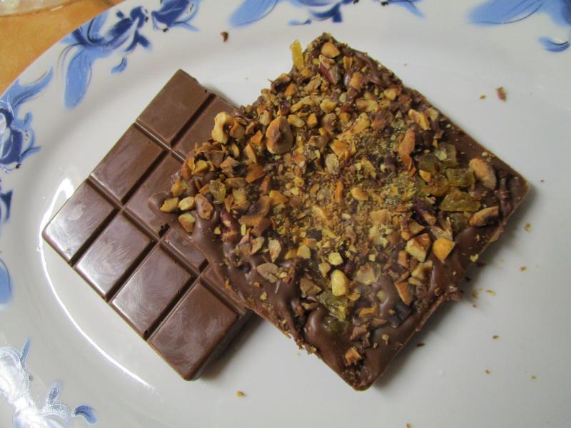 Quel plaisir de réaliser soi même sa tablette de chocolat Voici une tablette de chocolat jivara aux fruits secs; noisettes, noix de pécan et raisins pour tous les gourmands