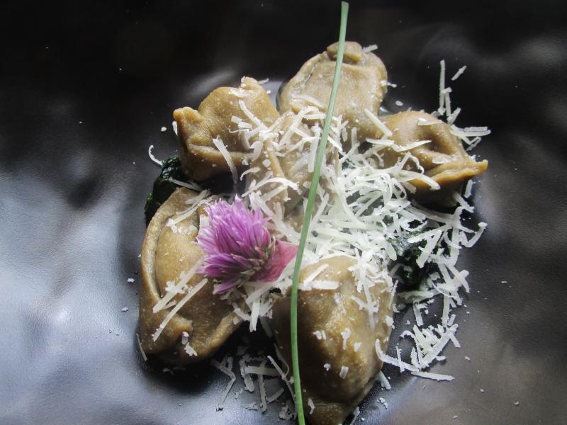 Une entrée pour un dimanche; des ravioles maison sur un lit d'épinards et d'orties.