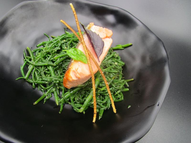 La salicorne revenue à l'huile d'olive avec un peu d'ail, des filets de saumon cuits à l'unilatéral. Des chips de spaghetti sans gluten grillés pour un joli croquant.
