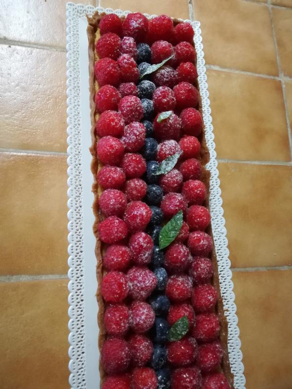 Une tarte aux framboises sur une crème d'amandes aux zestes de citron vert Pour la touche finale passer un sirop maison à la verveine sur les fruits et votre tarte brillera de mille feux.
