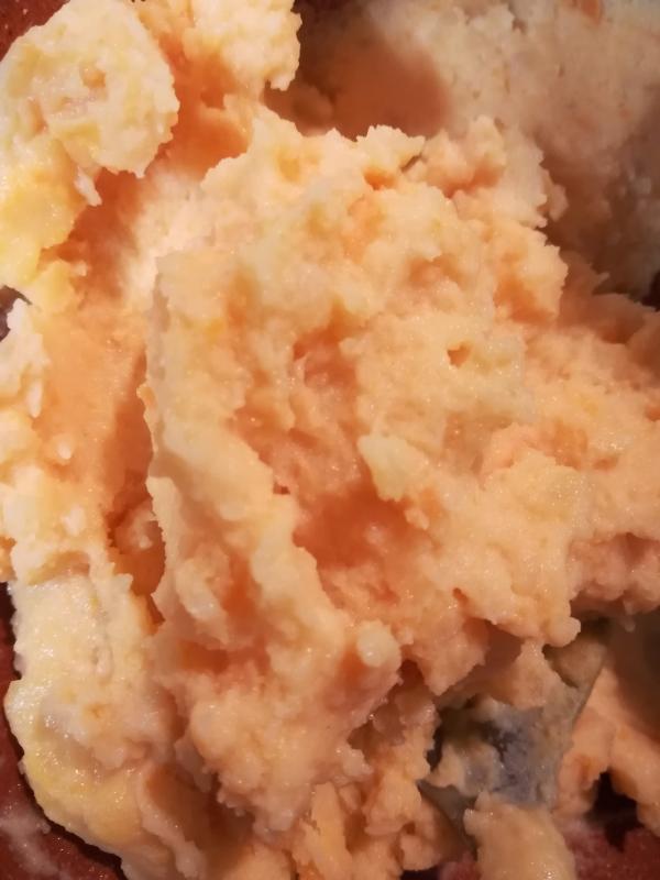 Une purée couleur d'Automne avec une touche exotique. 3 pommes de terre Une patate douce Un peu de curry De la crème de coco 20 g de beurre Une purée orangée pour accompagner un poulet au gingembre par exemple. Belle soirée