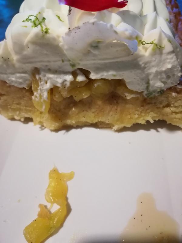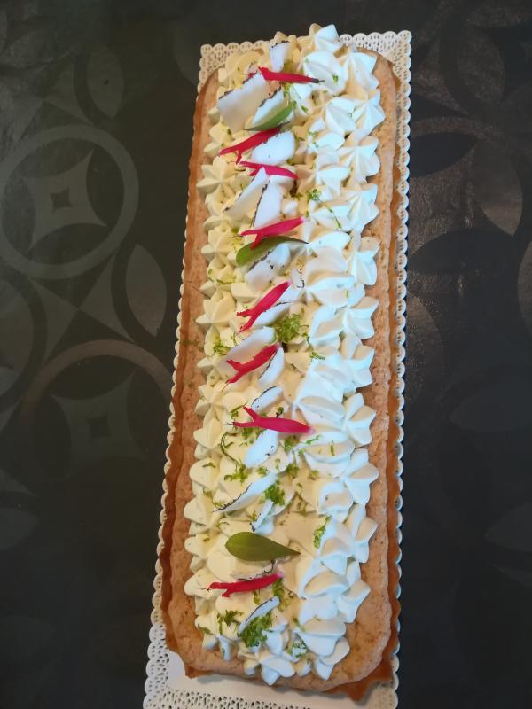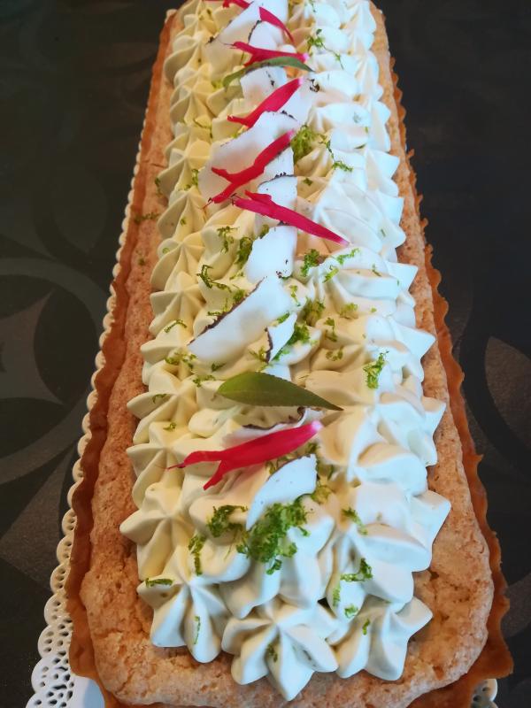 Voici une tarte qui fait voyager, une pâte sablée une crème d'amandes coco, Une compotée d'ananas au rhum,une ganache montée orelys, coco Malibucitron vert.