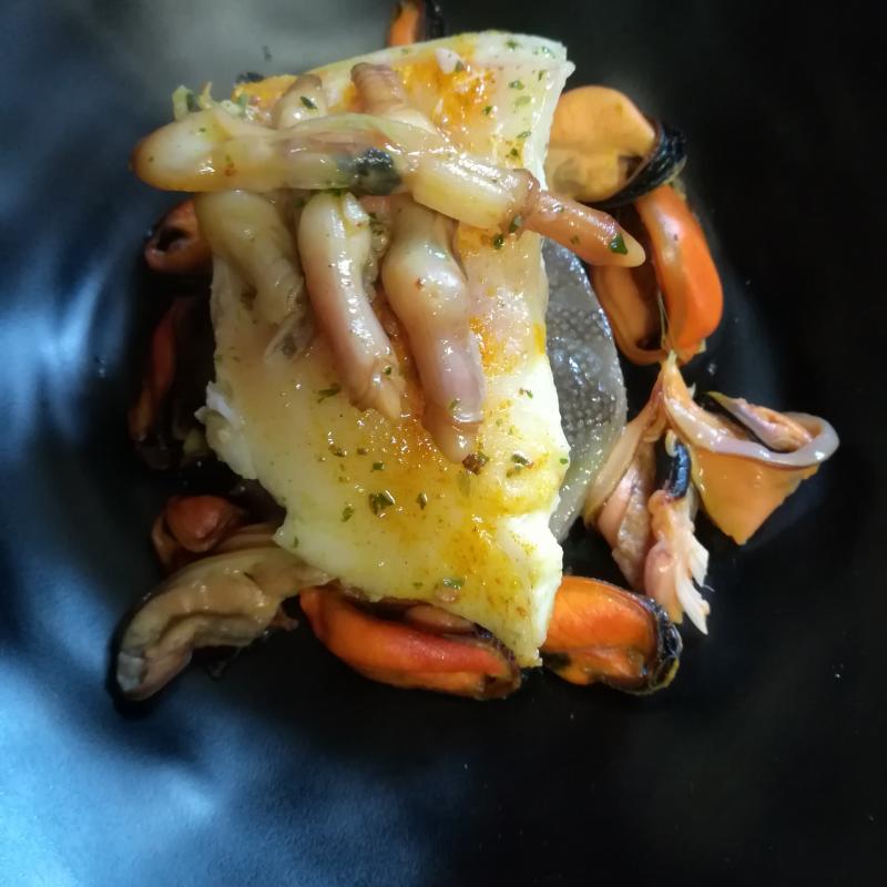Fond d'artichauts ,moules marinières, cabillaud rôti, couteaux snackés.