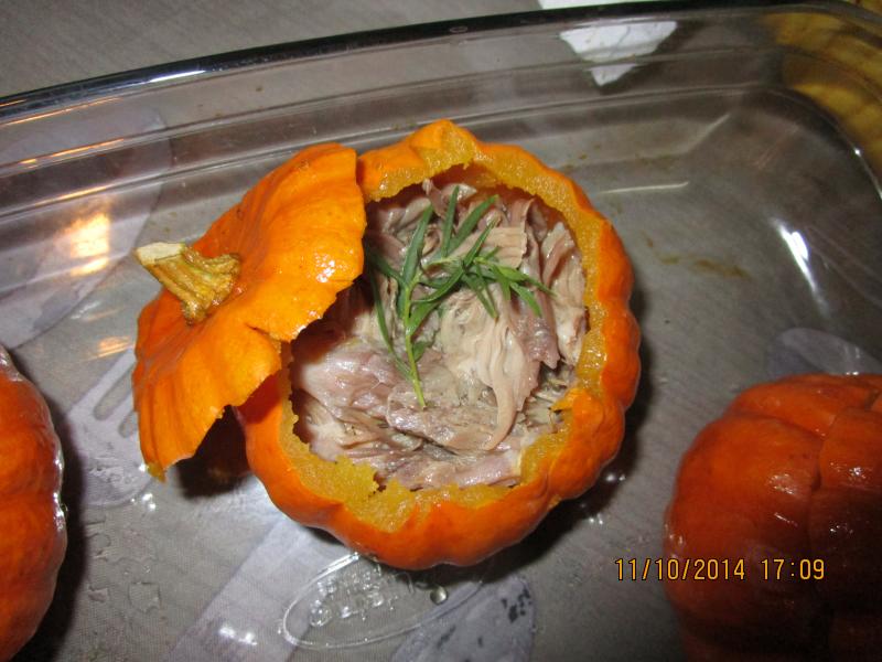 mettre le canard au fond de chaque potirons recouvrir du mélange mettre au four pour gratiner et le tour est joué
