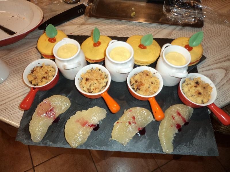 Crème de mangue, macarons mangue, crumble passion, et pour finir sur une note de fraicheur et de légèreté un carpaccio de pamplemousses au coulis de figues de barbarie