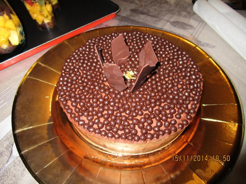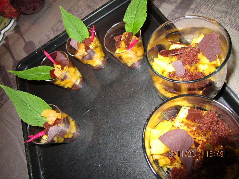 J'ai entrepris de réaliser le palet d'or un entremet chocolat une recette de Valrhona et comme il me restait du biscuit j'en ai déposé au fond de verrines, j'ai recouvert de dés de fruits; ananas Victoria, mangue, fruits de la passion, rhum vieux, caramel et j'ai terminé par des copeaux de chocolat et des fleurs et feuilles de sauge ananas, bon samedi!!