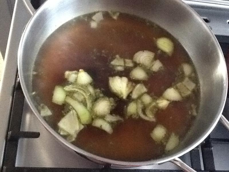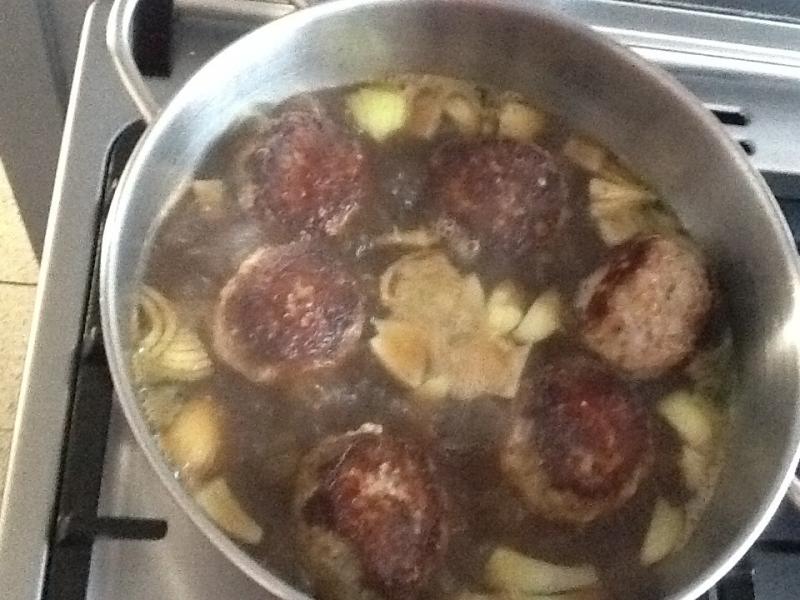 Dans une marmite j'ai mis de l'eau avec du sirop un oignon et un cube d'épice quand sa commence a bouillir je vais ajouter mes bouletes que j'ai précuit auparavant