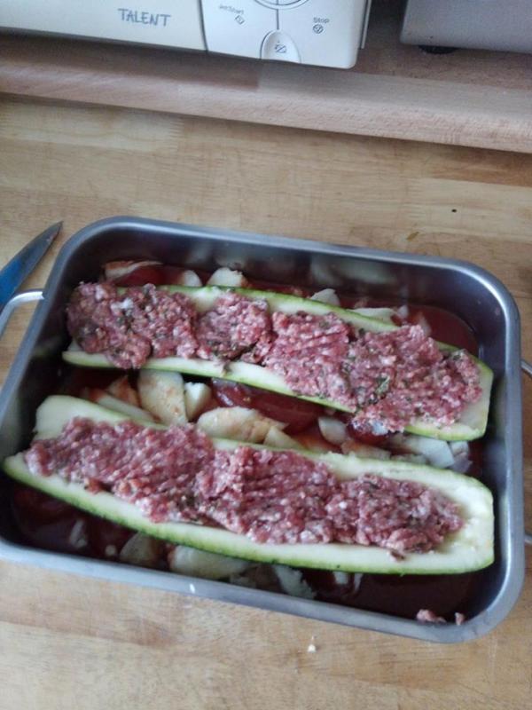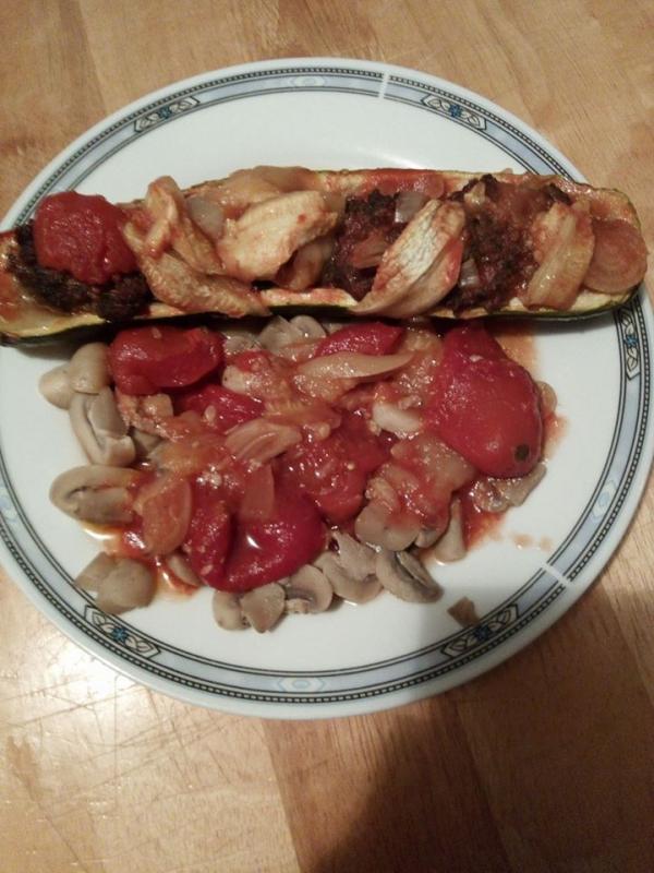 Je melange le tout et après avoir creusé ma courgette ( sans jeter la chair ) je farcie . Dans le fond de mon plat je vide la boîte de tomate pelée je met ma courgette sur Çe lit et au four pendant 45 min sur 190 degré.