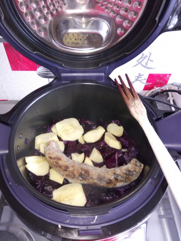 Puis je ajoute mon chou rouge sel poivre cassonade pomme et une saussise
