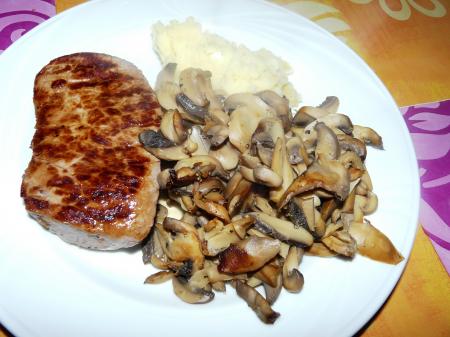 Dans une poële de tefal,je grille ma viande une fois retournée j'ai ajoutée mes champignons un peu de poivre et sur l'assiètte avec un peu de purée !!